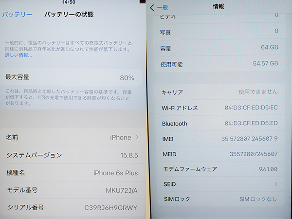 【中古】SIMロック解除 docomo iPhone6s Plus 64GB シルバー MKU72J/A SIMフリー 本体 制限〇 一括購入(QJA1069-4) ■状態■ ネットワーク利用制限○ 本体代金支払い済み SIMロック解除済みです。 [本体/液晶] フレームに小さい傷や擦れがあります。 液晶にキズはなく綺麗です。 [バッテリー] 出品時の最大容量 80% ※出荷までの保管期間で1~2%変動する場合あり。 リセット済み 動作問題なし AppleID削除済み ■Apple保証■ 保証期限切れ 2017年5月1日に期限切れ 購入日: 2016年5月1日 詳しくはアップル公式 保証状況サイトでご確認ください。 ■モデル型番■ MKU72J/A ■製造番号■ IMEI: 355728072456079 シリアル番号: C39RJ6H9GRWY ■付属品■ 本体のみ 2025/10/21 K