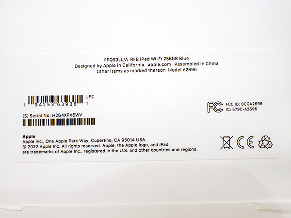 【新品 未開封】海外版 iPad 10.9インチ 第10世代 Wi-Fi 256GB ブルー FPQ93LL/A 2022年秋モデル 本体 整備済製品(QGA799-1) ■状態■ 新品未開封 APPLE 認定整備済製品 海外版(アメリカ合衆国/カナダ)です。 Wi-Fiモデルですので SIMカードを使っての通信・通話はできません。 万が一初期不良等がありましたら 直接Appleへお問い合わせください。 箱に保存に伴う傷みがあります。 ■保証状況■ 保証未開始です。 ※基本的に未開封(未アクティベーション)の状態ではAppleの保証は開始されませんが、稀に購入日から保証が開始されている場合がございます。 ※未開封品のため、初期不良が発生した場合は直接Appleにお問い合わせください。 詳しくはアップル公式 保証状況サイトでご確認ください。 ■モデル型番■ FPQ93LL/A こちらの商品は「MPQ93LL/A」の整備済製品です。 仕様は全て「FPQ93LL/A」に準じる商品です。 ■製造番号■ H2G4XPX6WV ■付属品■ 購入時のものはすべてあります。 ※購入レシートや納品書はございません。 2025/10/8 T