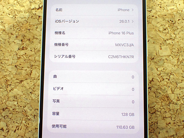 【中古】国内版SIMフリー iPhone 16 Plus 128GB ホワイト 白 MXVC3J/A 本体 一括購入 バッテリー最大容量95%(QKA1306-1) ■状態■ 国内版 SIMフリーです。 [フレーム/液晶] 傷や擦れがありますが、全体的に綺麗です。 写真でご確認ください。 [バッテリー] 出品時の最大容量 95% ※出荷までの保管期間で1~2% 変動する場合あり。 [Apple保証] 保証期限切れ 購入日: 2024年10月6日 2025年10月30日に期限切れ 詳しくはアップル公式 保証状況サイトでご確認ください。 動作問題なし リセット済み AppleID(アクティベーションロック)解除済み ■モデル型番■ MXVC3J/A ■製造番号■ IMEI: 357294141406155 シリアル番号: C2M6THKN7R ■付属品■ 本体、箱のみ 2025/11/7 T