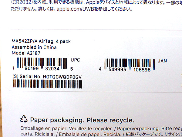 【新品 未開封】Apple 純正 AirTag エアタグ 4パック MX542ZP/A A2187 本体《全国一律送料430円》(QKA281-1) ■状態■ 新品未開封です。 万が一初期不良が発生した場合は直接メーカーにお問い合わせください。 ■保証状況■ 購入日: 2025年10月5日 限定保証 有効期限: 2026年10月4日 詳しくはアップル公式 保証状況サイトでご確認ください。 ■モデル型番■ MX542ZP/A ■製造番号■ HGTQCWQDP0GV ■付属品■ 購入時のものはすべてございます。 ※購入レシートや納品書等はございません 2025/11/7 T