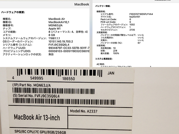 【中古】MacBook Air 13.3インチ 2020年 MGN63J/A スペースグレイ [M1チップ 8コア/8GB/SSD:256GB] 本体(QKA814-1) ■状態■ [本体/液晶] 傷や擦れがあります。 液晶ガラスに傷はありません。 [バッテリー] 充放電回数 10回 最大容量 100% ※出荷時の動作確認等で変わる可能性があります。 画像でご確認ください 動作問題なし リカバリー済み 初期化後、動作確認の為 初期設定を行っております パスワードは解除しておりますので、 ログイン画面では何も入力せず Enterキーでログインできる状態にしてお送りいたします。 ■スペック■ MacBook Air 発売時期: Late 2020 カラー : スペースグレイ CPU : Apple M1チップ 8コア メモリ : 8GB SSD : 256GB ■保証状況■ 保証期限切れ 2023年10月8日に期限切れ 購入日: 2022年10月8日 詳しくはアップル公式 保証状況サイトでご確認ください。 ■モデル型番■ MGN63J/A ■製造番号■ FVFJ9C3SQ6L4 ■付属品■ 写真でご確認いただけるものがすべてです。 2025/11/5 K
