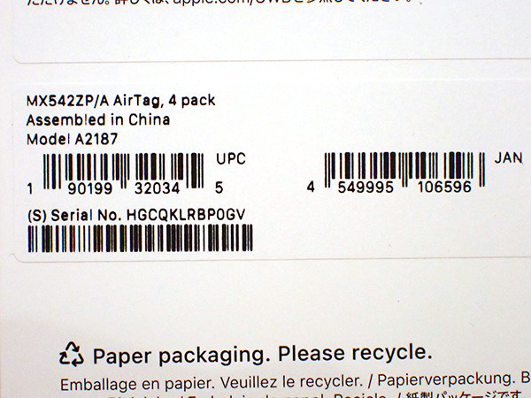 【新品 未開封】Apple 純正 AirTag エアタグ 4パック MX542ZP/A A2187 本体《全国一律送料430円》(QLA294-2) ■状態■ 新品未開封です。 万が一初期不良が発生した場合は直接メーカーにお問い合わせください。 ■保証状況■ 購入日: 2025年11月3日 限定保証 有効期限: 2026年11月2日 詳しくはアップル公式 保証状況サイトでご確認ください。 ■モデル型番■ MX542ZP/A ■製造番号■ HGCQKLRBP0GV ■付属品■ 購入時のものはすべてございます。 ※購入レシートや納品書等はございません 2025/11/7 T