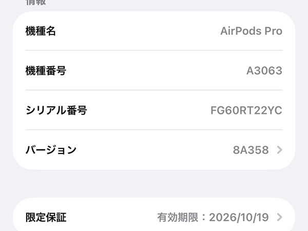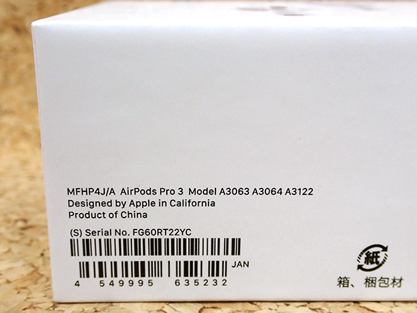【中古 良品】Apple 純正 AirPods Pro 第3世代 インイヤーアクティブノイズキャンセリング搭載 USB-C MFHP4J/A 本体(QLA604-2) ■状態■ [充電ケース/イヤホン] ケースに擦れはありますが、 目立つ大きな傷はありません。 イヤホンに目立つ大きな傷はありません。 写真でご確認ください。 動作問題なし ペアリング・通電確認済み 初期化済み ■保証状況■ 限定保証 有効期限:2026年10月19日 詳しくはアップル公式 保証状況サイトでご確認ください。 ■モデル型番■ MFHP4J/A ■製造番号■ FG60RT22YC ■付属品■ 写真でご確認いただけるものがすべてです。 2025/11/19 K
