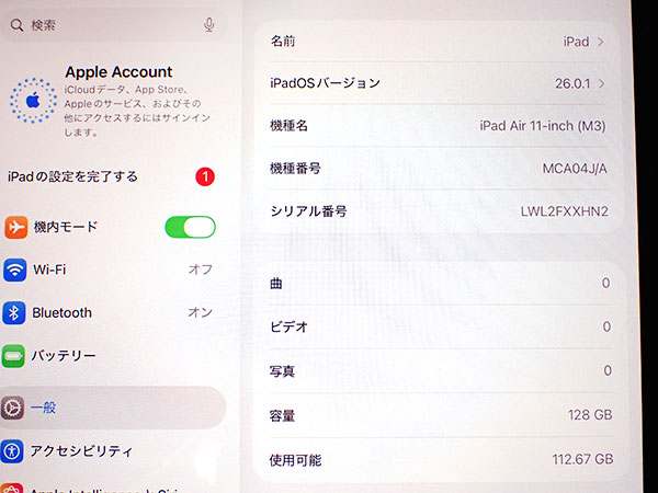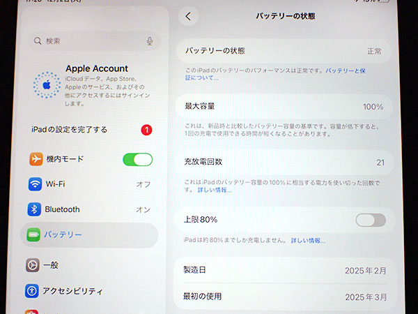 【中古 美品】iPad Air 11インチ M3 第7世代 Wi-Fi 128GB パープル MCA04J/A 2025年春モデル 本体 未使用付属完品 バッテリー最大容量100%(QKA1050-1) ■状態■ Wi-Fiモデルですので SIMカードを使っての通信・通話はできません。 [フレーム、液晶] キズや擦れはなくとても綺麗です。 動作問題なし リセット済み AppleID削除済み [バッテリー] バッテリー最大容量:100% ※検査ソフトで確認しています。 ※出荷までの保管期間で1~2% 変動する場合あり。 数値は目安としてお考え下さい。 【Apple保証】 購入日: 2025年3月27日 限定保証 有効期限: 2026年3月27日 詳しくはアップル公式 保証状況サイトでご確認ください。 ■モデル型番■ MCA04J/A ■製造番号■ LWL2FXXHN2 ■付属品■ 購入時のものは全てあります。 ※納品書、レシートはありません。 2025/12/2 T