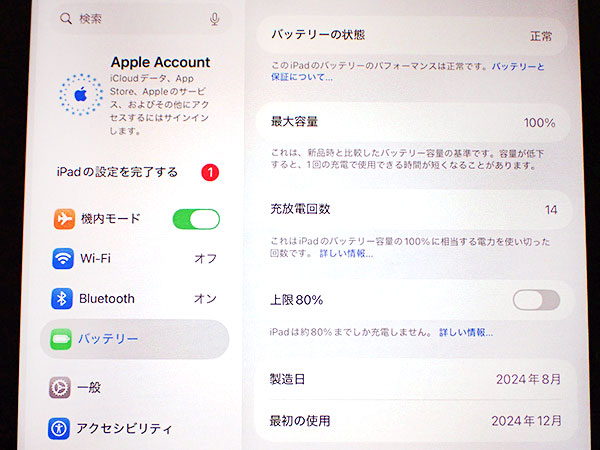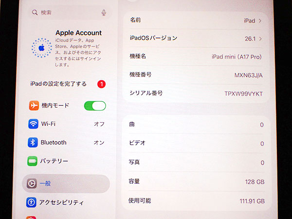 【中古 美品】iPad mini 8.3インチ 第7世代 Wi-Fi 128GB スペースグレイ MXN63J/A 2024年秋モデル 本体 未使用付属完品 バッテリー最大容量100%(QMA285-1) ■状態■ Wi-Fiモデルですので SIMカードを使っての通信・通話はできません。 [フレーム、液晶] Apple Pencilと接続する部分(磁気コネクタ)にうっすらと擦れがあります。 その他に傷や擦れはなくとても綺麗です。 動作問題なし リセット済み AppleID削除済み [バッテリー] 出品時の最大容量 93% ※出荷までの保管期間で1~2% 変動する場合あり。 【Apple保証】 購入日: 2024年12月30日 限定保証 有効期限:2025年12月29日 詳しくはアップル公式 保証状況サイトでご確認ください。 ■モデル型番■ MXN63J/A ■製造番号■ TPXW99VYKT ■付属品■ 購入時のものは全てあります。 ※納品書、レシートはありません。 2025/12/9 T