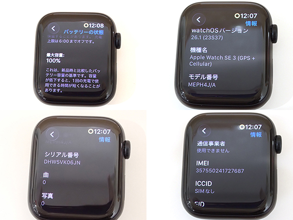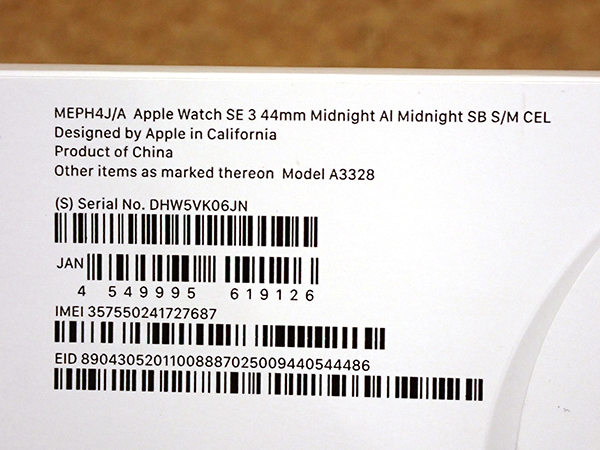 【中古 美品】Apple Watch SE 第3世代 Cellular 44mm ミッドナイトアルミニウムケース と スポーツバンド S/M MEPH4J/A(QLA743-1) ■状態■ [本体/液晶] 目立つ傷は無く綺麗な状態です。 [ミッドナイトスポーツバンド S/M] 新品未開封 外箱に傷みがあります。 画像でご確認ください 動作問題なし ペアリング解除済み AppleID削除済み(アクティベーションロック解除済み) ■保証状況■ 購入日: 2025年9月19日 詳しくはアップル公式 保証状況サイトでご確認ください。 ■モデル型番■ MEPH4J/A ■製造番号■ IMEI:357550241727687 シリアル番号: DHW5VK06JN ■付属品■ 写真でご確認いただけるものがすべてです。 2025/12/9 K