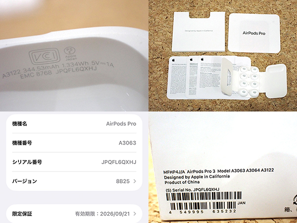 【中古 良品】Apple 純正 AirPods Pro 第3世代 インイヤーアクティブノイズキャンセリング搭載 USB-C MFHP4J/A 本体(QLB156-1) ■状態■ [充電ケース/イヤホン] ケースに擦れはありますが、 目立つ大きな傷はありません。 イヤホンに目立つ大きな傷はありません。 写真でご確認ください。 動作問題なし ペアリング・通電確認済み ■保証状況■ 限定保証 有効期限:2026年9月21日 詳しくはアップル公式 保証状況サイトでご確認ください。 ■モデル型番■ MFHP4J/A ■製造番号■ JPQFL6QXHJ ■付属品■ 写真でご確認いただけるものがすべてです。 2025/12/9 K