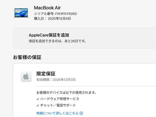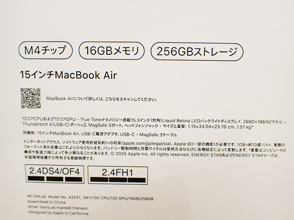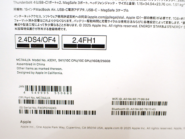 【新品 未開封】MacBook Air 15.3インチ 2025年モデル MC7A4J/A スカイブルー[M4チップ 10コア/メモリ 16GB/SSD 256GB](QMA242-3) ■状態■ 新品未開封 未開封品のため、万が一初期不良等があった場合は直接Appleへお問い合わせください。 ■スペック■ MacBook Air 15.3インチ 発売時期: Early 2025 カラー : スカイブルー CPU : Apple M4チップ 10コア メモリ : 16GB SSD : 256GB ■保証状況■ 購入日: 2025年12月4日 限定保証 有効期限:2026年12月3日 詳しくはアップル公式 保証状況サイトでご確認ください。 ■モデル型番■ MC7A4J/A ■製造番号■ FW3PGY42KD ■付属品■ 購入時のものはすべてございます。 ※購入レシート・納品書はございません 2025/12/9 K