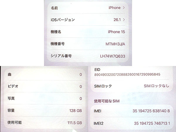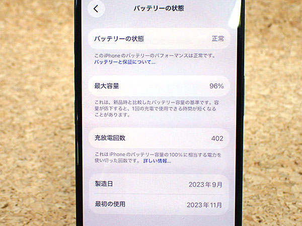 【中古】国内版SIMフリー iPhone 15 128GB ブラック 黒 MTMH3J/A 本体 一括購入 バッテリー最大容量96%(QLA1085-1) ■状態■ SIMフリー端末です。 [本体/液晶] フレームにキズや擦れ、うっすらとケース跡があります。 液晶にキズはありません。 [バッテリー] 出品時の最大容量 96% ※出荷までの保管期間で1~2%変動する場合あり。 リセット済み 動作問題なし AppleID削除済み ■Apple保証■ 保証期限切れ 購入済み 2023年11月4日 2025年12月5日に期限切れ 詳しくはアップル公式 保証状況サイトでご確認ください。 ■モデル型番■ MTMH3J/A ■製造番号■ IMEI: 351947256381408 シリアル番号: LH74W7Q633 ■付属品■ 本体、箱のみ 2025/12/16 T