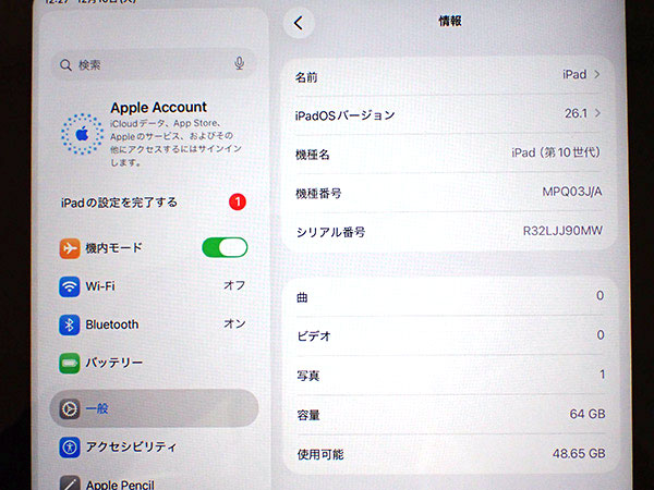 【中古 美品】iPad 10.9インチ 第10世代 Wi-Fi 64GB シルバー MPQ03J/A 2022年秋モデル 本体 バッテリー最大容量96%(QMA497-1) ■状態■ Wi-Fiモデルですので SIMカードを使っての通信・通話はできません。 [フレーム、液晶] キズや擦れはなくとても綺麗です。 動作問題なし リセット済み AppleID(アクティベーションロック)削除済み [バッテリー] バッテリー最大容量:96% ※出荷までの保管期間で1~2% 変動する場合あり。 ※検査ソフトで確認しています。 数値は目安としてお考え下さい。 【Apple保証】 購入済み 2024年5月8日 詳しくはアップル公式 保証状況サイトでご確認ください。 ■モデル型番■ MPQ03J/A ■製造番号■ R32LJJ90MW ■付属品■ 本体、印刷物、箱のみ 2025/12/16 T