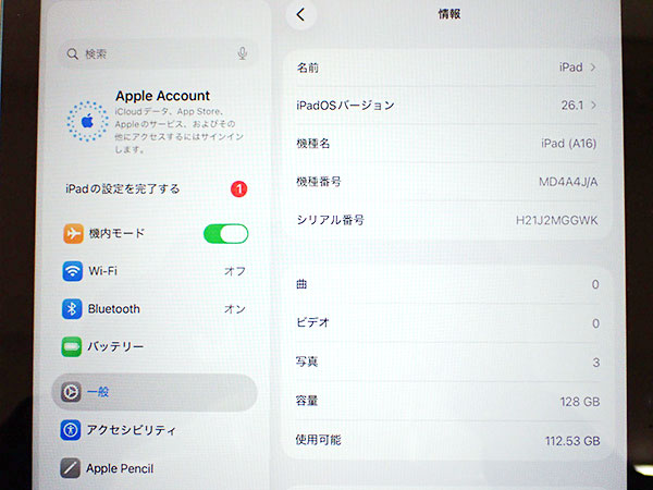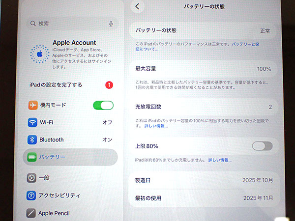 【中古 美品】iPad 11世代 A16 Wi-Fi 128GB ブルー 青 MD4A4J/A 2025年春モデル 本体 付属完品 バッテリー最大容量100%(QMA236-1) ■状態■ Wi-Fiモデルですので SIMカードを使っての通信・通話はできません。 [フレーム、液晶] キズや擦れはなくとても綺麗です。 動作問題なし リセット済み AppleID(アクティベーションロック)削除済み [バッテリー] バッテリー最大容量:100% ※出荷までの保管期間で1~2% 変動する場合あり。 【Apple保証】 購入済み 2025年11月26日 限定保証 有効期限:2026年11月25日 詳しくはアップル公式 保証状況サイトでご確認ください。 ■モデル型番■ MD4G4J/A ■製造番号■ H21J2MGGWK ■付属品■ 本体、ケーブル、アダプタ、箱のみ 2025/12/16 T