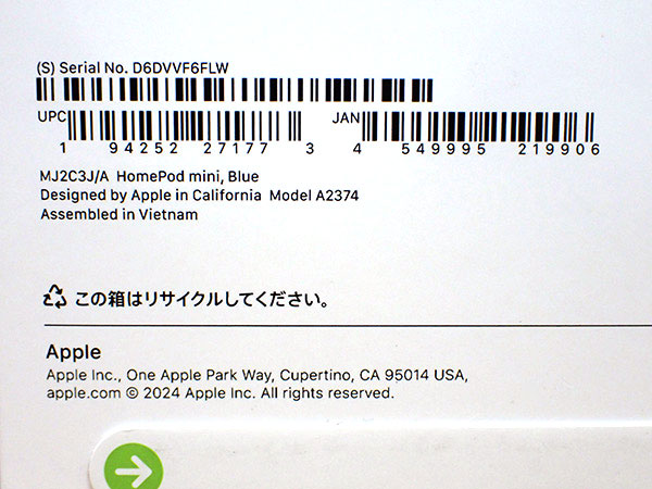 【新品 未開封】Apple HomePod mini MJ2C3J/A ブルー 青 A2374 Bluetooth スマート スピーカー(QMA561-2) ■状態■ 新品未開封 ※未開封品のため、初期不良が発生した場合は直接Appleにお問い合わせください。 ■Apple保証■ 購入済み 2025年12月11日 限定保証 有効期限:2026年12月10日 詳しくはアップル公式 保証状況サイトでご確認ください。 ■モデル型番■ MJ2C3J/A ■製造番号■ D6DVVF6FLW ■付属品■ 購入時のものはすべてございます。 ※購入レシート・納品書はございません 2025/12/16 T