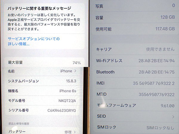 【中古】SIMロック解除 Softbank iPhone6s 128GB スペースグレイ MKQT2J/A SIMフリー 制限〇 一括購入(QCA255-2) ■状態■ ネットワーク利用制限〇 本体代金支払い済み SIMロック解除済みです。 [本体/液晶] 小さい傷や擦れがあります。 液晶に傷はありません。 写真でご確認ください。 [バッテリー] 出品時の最大容量 74% ※出荷までの保管期間で1~2%変動する場合あり。 ※修理表示です。 急にシャットダウンする等の不具合は見られませんが、バッテリー劣化があります。 ご理解いただける方のみ落札をお願いします。 リセット済み 動作問題なし AppleID(アクティベーションロック)解除済み ■Apple保証■ 保証期限切れ 購入済み 2015年9月26日 2016年9月26日に期限切れ 詳しくはアップル公式 保証状況サイトでご確認ください。 ■モデル型番■ NKQT2J/A ※タイトルでは"MKQT2J/A"と記載しておりますが こちら交換品の為、正しくは"NKQT2J/A"です。 ■製造番号■ IMEI: 355695077693222 シリアル番号: C6KR4623GRYG ■付属品■ 本体のみ 2025/12/17 K