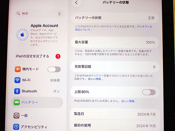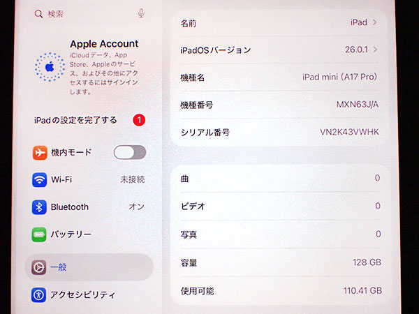 【中古 美品】iPad mini 8.3インチ 第7世代 Wi-Fi 128GB スペースグレイ MXN63J/A 2024年秋モデル 本体 バッテリー最大容量100% カバー付き(QKA1132-2) ■状態■ Wi-Fiモデルですので SIMカードを使っての通信・通話はできません。 [本体/液晶] 傷や擦れはなくとても綺麗です。 iPad mini用Smart Folio チャコールグレイをお付けします。 中古品ですが、まだまだご使用いただけます。 [バッテリー] 出品時の最大容量 100% ※出荷までの保管期間で1~2%変動する場合あり。 リセット済み 動作問題なし AppleID削除済み ■Apple保証■ 保証期限切れ 購入日: 2024年11月11日 2025年11月11日に期限切れ 詳しくはアップル公式 保証状況サイトでご確認ください。 ■モデル型番■ MXN63J/A ■製造番号■ VN2K43VWHK ■付属品■ 本体、Smart Folio(中古) 2025/12/12 T