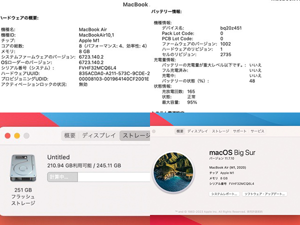 ☆【中古】MacBook Air 13.3インチ 2020年モデル MGN63J/A スペースグレイ[M1チップ 8コア /メモリ 8GB / SSD 256GB](QZ193-16) ■状態■ [本体/液晶] 小さい傷や擦れがあります。 写真には写りませんでしたが、 液晶ガラスに薄っすらとした擦れがあります。 [バッテリー] 充放電回数 : 165回 状態 : 正常 最大容量 : 95% ※出荷時の動作確認等で変わる可能性があります。 画像でご確認ください 動作問題なし リカバリー済み 初期化後、動作確認の為 初期設定を行っております パスワードは解除しておりますので、 ログイン画面では何も入力せず Enterキーでログインできる状態にしてお送りいたします。 ■スペック■ MacBook Air 13.3インチ 発売時期: Late 2020 カラー : スペースグレイ CPU : Apple M1チップ 8コア メモリ : 8GB SSD : 256GB ■保証状況■ 保証期限切れ 購入済み 2021年3月21日 2022年3月21日に期限切れ 詳しくはアップル公式 保証状況サイトでご確認ください。 ■モデル型番■ MGN63J/A ■製造番号■ FVHF32MCQ6L4 ■付属品■ 本体のみ ※ACアダプタ・ケーブルはございません。 2025/12/18 K