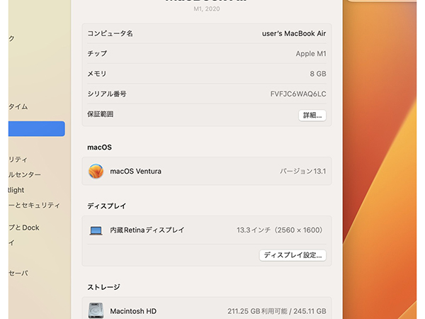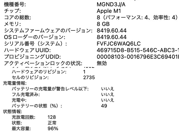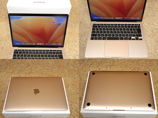 【中古】MacBook Air 13.3インチ 2020年モデル MGND3J/A ゴールド[M1チップ 8コア /メモリ 8GB / SSD 256GB](QLA638-2) ■状態■ [本体/液晶] 傷や擦れが複数あります。 液晶ガラスに目立つ大きな傷はありません。 [バッテリー] 充放電回数 : 128回 状態 : 正常 最大容量 : 96% ※出荷時の動作確認等で変わる可能性があります。 画像でご確認ください 動作問題なし リカバリー済み 初期化後、動作確認の為 初期設定を行っております パスワードは解除しておりますので、 ログイン画面では何も入力せず Enterキーでログインできる状態にしてお送りいたします。 ■スペック■ MacBook Air 13.3インチ 発売時期: Late 2020 カラー : ゴールド CPU : Apple M1チップ 8コア メモリ : 8GB SSD : 256GB ■保証状況■ 保証期限切れ 購入済み 2022年12月28日 2023年12月28日に期限切れ 詳しくはアップル公式 保証状況サイトでご確認ください。 ■モデル型番■ MGND3J/A ■製造番号■ FVFJC6WAQ6LC ■付属品■ 写真でご確認いただけるものがすべてです。 ※ACアダプタとケーブルはございません。 2025/12/18 K