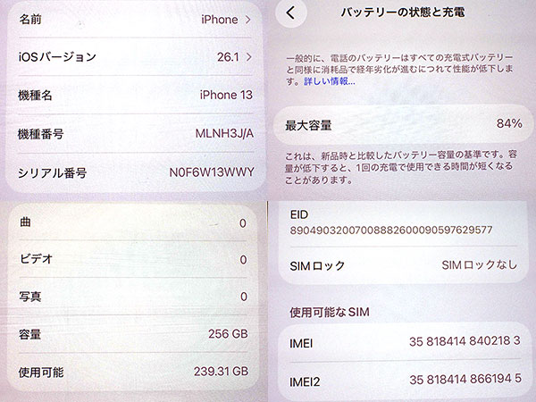 【中古】SIMフリー docomo iPhone 13 256GB ミッドナイト 黒 MLNH3J/A 本体 制限〇 一括購入(QLA1396-3) ■状態■ ネットワーク利用制限〇 本体代金支払い済み SIMフリー端末です。 [本体/液晶] フレームにキズやテカリがあります。 液晶にキズが複数あります。 写真でご確認ください。 [バッテリー] 出品時の最大容量 84% ※出荷までの保管期間で1~2%変動する場合あり。 動作問題なし リセット済み AppleID(アクティベーションロック)解除済み ■Apple保証■ 保証期限切れ 購入済み 2022年4月9日 2023年4月9日に期限切れ 詳しくはアップル公式 保証状況サイトでご確認ください。 ■モデル型番■ MLNH3J/A ■製造番号■ IMEI: 358184148402183 シリアル番号: N0F6W13WWY ■付属品■ 本体のみ 2025/12/25 T