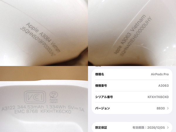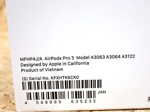 【中古 美品】Apple 純正 AirPods Pro 第3世代 インイヤーアクティブノイズキャンセリング搭載 USB-C MFHP4J/A 本体(QMA889-1) ■状態■ [充電ケース/イヤホン] 充電ケースに薄っすらとした擦れはありますが、 その他目立つ大きな傷はなく綺麗な状態です。 写真でご確認ください。 動作問題なし ペアリング・通電確認済み 初期化済み ■保証状況■ 購入済み 2025年12月5日 限定保証 有効期限 2026年12月5日 詳しくはアップル公式 保証状況サイトでご確認ください。 ■モデル型番■ MFHP4J/A ■製造番号■ KFXHTK6CK0 ■付属品■ 写真でご確認いただけるものがすべてです。 2025/12/23 K