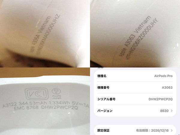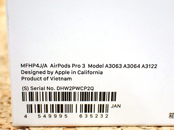 【中古 美品】Apple 純正 AirPods Pro 第3世代 インイヤーアクティブノイズキャンセリング搭載 USB-C MFHP4J/A 本体(QMA900-1) ■状態■ [充電ケース/イヤホン] 充電ケースに薄っすらとした擦れはありますが、 その他目立つ大きな傷はなく綺麗な状態です。 写真でご確認ください。 動作問題なし ペアリング・通電確認済み 初期化済み ■保証状況■ 購入済み 2025年12月15日 限定保証 有効期限 2026年12月16日 詳しくはアップル公式 保証状況サイトでご確認ください。 ■モデル型番■ MFHP4J/A ■製造番号■ DHW2PWCP2Q ■付属品■ 写真でご確認いただけるものがすべてです。 2025/12/23 K