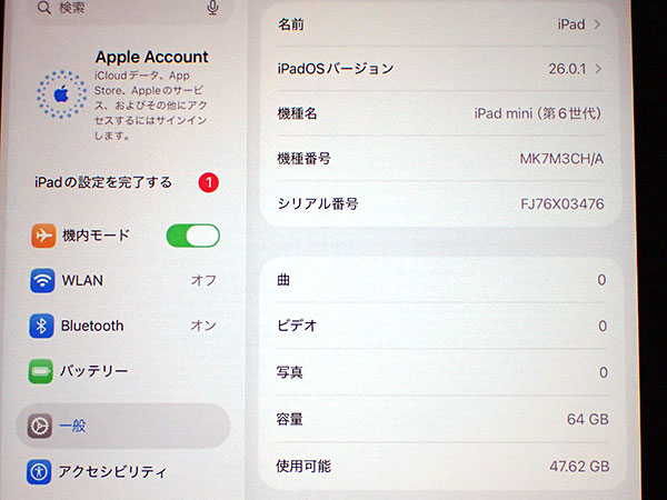 【中古 美品】海外版 iPad mini 8.3インチ 第6世代 Wi-Fi 64GB スペースグレイ MK7M3CH/A 2021年秋モデル 本体(QKA903-3) ■状態■ 海外版(中国)です。 Wi-Fiモデルですので SIMカードを使っての通信・通話はできません。 [本体/液晶] 背面のロゴマークに擦れがあります。 アウトカメラにうっすらと擦れがありますが撮影に問題はありません。 動作問題なし リセット済み AppleID(アクティベーションロック)削除済み [バッテリー] 出品時の最大容量 92% ※検査ソフトで確認しています。 数値は目安としてお考え下さい。 ※出荷までの保管期間で1~2%変動する場合あり。 ■Apple保証■ 保証期限切れ 購入済み 2021年9月25日 2022年9月25日に期限切れ 詳しくはアップル公式 保証状況サイトでご確認ください。 ■モデル型番■ MK7M3CH/A ■製造番号■ FJ76X03476 ■付属品■ 本体のみ 2025/12/18 T