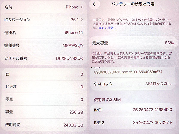 【中古】SIMフリー docomo iPhone 14 256GB ミッドナイト MPVW3J/A 本体 制限〇 一括購入(QLA1088-1) ■状態■ ネットワーク利用制限〇 本体代金支払い済み SIMフリー端末です。 [本体/液晶] キズや擦れが複数あります。 写真でご確認ください。 [バッテリー] 出品時の最大容量 86% ※出荷までの保管期間で1~2%変動する場合あり。 リセット済み 動作問題なし AppleID削除済み ■Apple保証■ 保証期限切れ 購入済み 2022年10月26日 2023年10月26日に期限切れ 詳しくはアップル公式 保証状況サイトでご確認ください。 ■モデル型番■ MPVW3J/A ■製造番号■ IMEI: 352604724168490 シリアル番号: D6XFQN9XQK ■付属品■ 本体のみ 2026/1/6 T