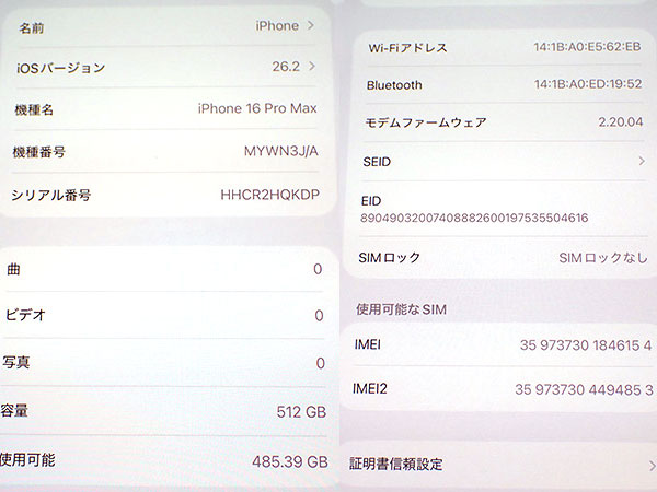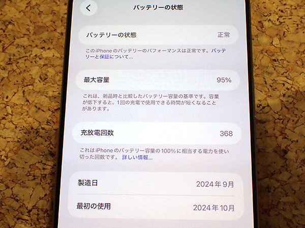 【中古 良品】国内版 SIMフリー iPhone 16 Pro Max 512GB デザートチタニウム MYWN3J/A 本体 一括購入(RAB66-1) ■状態■ 国内版 SIMフリーです。 [フレーム/液晶] 傷や擦れはなくとても綺麗です。 [カメラ] リアカメラで撮影すると薄っすら黒の丸い影が映ります。 ※通常の撮影では、ほとんど気にならない程度です。 写真7枚目の赤丸付近をご確認ください。 [バッテリー] 出品時の最大容量 95% ※出荷までの保管期間で1~2% 変動する場合あり。 [Apple保証] 保証期限切れ 購入日: 2024年9月26日 2025年10月30日に期限切れ 詳しくはアップル公式 保証状況サイトでご確認ください。 動作問題なし リセット済み AppleID(アクティベーションロック)解除済み ■モデル型番■ MYWN3J/A ■製造番号■ IMEI: 359737301846154 シリアル番号: HHCR2HQKDP ■付属品■ 本体、箱のみ 2026/1/23 T
