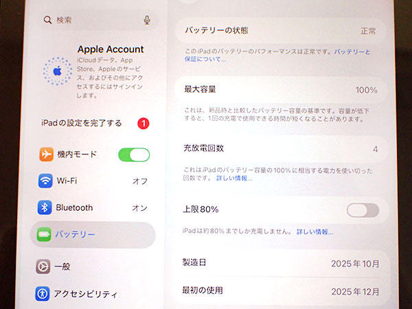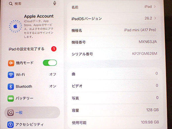 【中古 美品】iPad mini 8.3インチ 第7世代 Wi-Fi 128GB スペースグレイ MXN63J/A 2024年秋モデル 本体 未使用付属完品 バッテリー最大容量100%(RAA261-1) ■状態■ Wi-Fiモデルですので SIMカードを使っての通信・通話はできません。 [フレーム、液晶] 傷や擦れはなくとても綺麗です。 液晶画面に保護フィルムを貼っています。 綺麗に貼れているので剥がさずにお届けします。 動作問題なし リセット済み AppleID削除済み [バッテリー] 出品時の最大容量 100% ※出荷までの保管期間で1~2% 変動する場合あり。 【Apple保証】 購入済み 2025年12月10日 限定保証 有効期限:2026年12月9日 詳しくはアップル公式 保証状況サイトでご確認ください。 ■モデル型番■ MXN63J/A ■製造番号■ KP2FGM626M ■付属品■ 購入時のものは全てあります。 ※納品書、レシートはありません。 2026/1/21 T