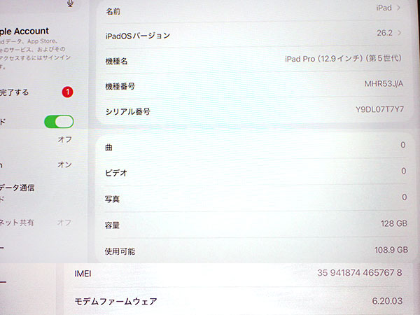 【中古 美品】SIMロック解除 Softbank iPad Pro 12.9インチ 第5世代 Cellular 128GB シルバー MHR53J/A 2021年春モデル 制限〇 SIMフリー 本体 未使用付属完品(RAB64-2) ■状態■ SIMロック解除済みです。 ネットワーク利用制限〇 本体代金支払い済みです。 [本体/液晶] フレームにキズや擦れはなくとても綺麗です。 液晶に小さなキズや擦れがあります。 写真でご確認ください。 動作問題なし リセット済み AppleID削除済み [バッテリー] 出品時の最大容量 96% ※検査ソフトで確認しています。 数値は目安としてお考え下さい。 ※出荷までの保管期間で1~2% 変動する場合あり。 [APPLE保証] 購入済み 2021年11月18日 保証期限切れ 2022年11月18日に期限切れ 詳しくはアップル公式 保証状況サイトでご確認ください。 ■モデル型番■ MHR53J/A ■製造番号■ IMEI : 359418744657678 シリアル番号 : Y9DL07T7Y7 ■付属品■ 写真でご確認いただけるものがすべてです。 ※付属品は未使用です。 2026/1/21 T