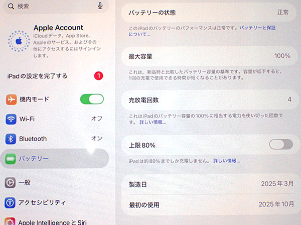 【中古 美品】iPad Pro 11インチ M4 第5世代 Wi-Fi 256GB スペースブラック MVV83J/A 2024年春モデル 本体 付属完品 バッテリー容量100%(RAA212-1) ■状態■ Wi-Fiモデルですので SIMカードを使っての通信・通話はできません。 [フレーム/液晶] キズや擦れはなくとても綺麗です。 動作問題なし リセット済み AppleID(アクティベーションロック)削除済み [バッテリー] 出品時の最大容量 100% ※出荷までの保管期間で1~2% 変動する場合あり。 ※検査ソフトで確認しています。 数値は目安としてお考え下さい。 【Apple保証】 購入済み 2025年10月4日 限定保証 有効期限:2026年10月3日 詳しくはアップル公式 保証状況サイトでご確認ください。 ■モデル型番■ MVV83J/A ■製造番号■ DG7R7443F5 ■付属品■ 写真でご確認いただけるものが全てです。 2026/1/15 T