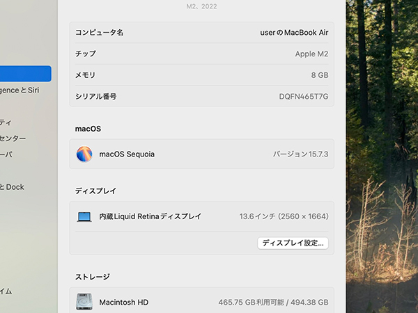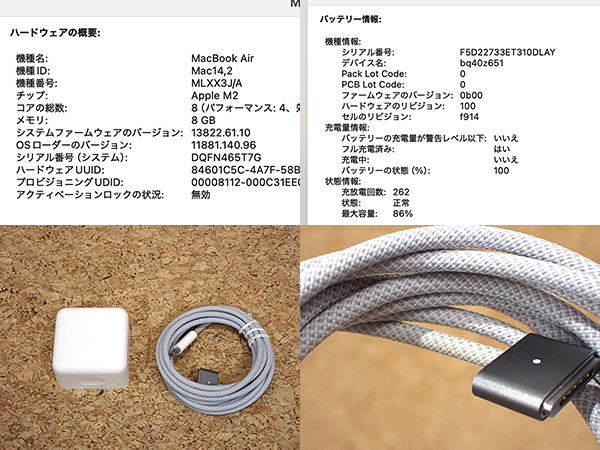 【中古】MacBook Air 13.6インチ 2022年 MLXX3J/A スペースグレイ [M2チップ 8コア/メモリ:8GB/SSD:512GB] 本体(RAB125-1) ■状態■ [本体/液晶] 使用に伴う擦れやキーボードにテカリはありますが、 目立つ大きな傷はありません。 液晶ガラスに擦れがあります。 [バッテリー] 充放電回数 262回 最大容量 86% ※出荷時の動作確認等で変わる可能性があります。 画像でご確認ください 動作問題なし リカバリー済み 初期化後、動作確認の為 初期設定を行っております パスワードは解除しておりますので、 ログイン画面では何も入力せず Enterキーでログインできる状態にしてお送りいたします。 充電ケーブルが黄色く変色している箇所があります。 ■スペック■ MacBook Air 13.6インチ 発売時期: Mid 2022 カラー : スペースグレイ CPU : Apple M2チップ 8コア メモリ : 8GB SSD : 512GB ■保証状況■ 保証期限切れ 2023年10月22日に期限切れ 購入済み 2022年10月22日 詳しくはアップル公式 保証状況サイトでご確認ください。 ■モデル型番■ MLXX3J/A ■製造番号■ DQFN465T7G ■付属品■ 本体、充電ケーブル、ACアダプタのみ 2026/1/29 K