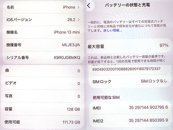 【中古 美品】国内版 SIMフリー iPhone 13 mini 128GB スターライト 白 MLJE3J/A 本体 一括購入 バッテリー最大容量97%(RAA1132-1) ■状態■ 国内版 SIMフリーモデルです。 [本体/液晶] キズや擦れはなく綺麗です。 [バッテリー] 出品時の最大容量 97% ※出荷までの保管期間で1~2%変動する場合あり。 リセット済み 動作問題なし AppleID削除済み ■Apple保証■ 保証期限切れ 購入済み 2023年12月5日 2024年12月5日に期限切れ 詳しくはアップル公式 保証状況サイトでご確認ください。 ■モデル型番■ MLJE3J/A ■製造番号■ IMEI: 352971449027958 シリアル番号: K9R0JG6MKQ ■付属品■ 本体のみ 2026/2/11 T