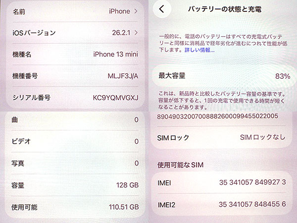 【中古】SIMフリー docomo iPhone 13 mini 128GB ピンク MLJF3J/A 本体 制限〇 一括購入(RBB47-2) ■状態■ ネットワーク利用制限〇 本体代金支払い済みです。 SIMフリー端末です。 [本体/液晶] キズや擦れがあります。 写真でご確認ください。 [バッテリー] 出品時の最大容量 83% ※出荷までの保管期間で1~2%変動する場合あり。 リセット済み 動作問題なし AppleID削除済み ■Apple保証■ 保証期限切れ 購入済み 2022年2月6日 2023年2月6日に期限切れ 詳しくはアップル公式 保証状況サイトでご確認ください。 ■モデル型番■ MLJF3J/A ■製造番号■ IMEI: 353410578499273 シリアル番号: KC9YQMVGXJ ■付属品■ 本体のみ 2026/2/11 T