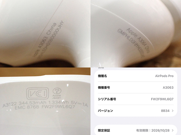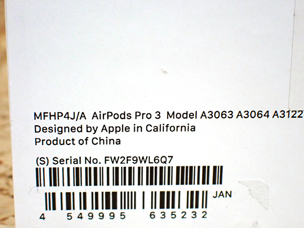 【中古 良品】Apple 純正 AirPods Pro 第3世代 インイヤーアクティブノイズキャンセリング搭載 USB-C MFHP4J/A(RBA260-1) ■状態■ [充電ケース/イヤホン] ケースに擦れはありますが、 目立つ大きな傷はありません。 イヤホンに目立つ大きな傷はありません。 写真でご確認ください。 動作問題なし ペアリング・通電確認済み 初期化済み ■保証状況■ 購入済み 2025年10月29日 限定保証 有効期限:2026年10月28日 詳しくはアップル公式 保証状況サイトでご確認ください。 ■モデル型番■ MFHP4J/A ■製造番号■ FW2F9WL6Q7 ■付属品■ 写真でご確認いただけるものがすべてです。 2026/2/19 K