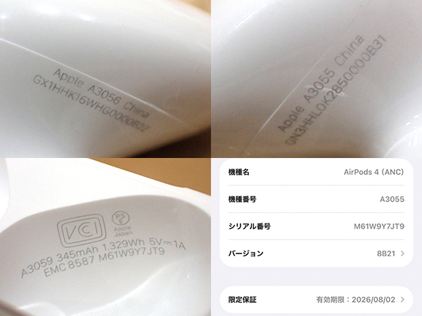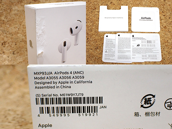 【中古 良品】Apple 純正 AirPods 4 アクティブノイズキャンセリング搭載モデル MXP93J/A 本体 ワイヤレス イヤホン(QMA202-1) ■状態■ [充電ケース/イヤホン] ケースに擦れはありますが、 目立つ大きな傷はありません。 イヤホンに目立つ大きな傷はありません。 写真でご確認ください。 動作問題なし ペアリング・通電確認済み 初期化済み 外箱に傷みがあります。 ■保証状況■ 限定保証 有効期限:2026年8月2日 詳しくはアップル公式 保証状況サイトでご確認ください。 ■モデル型番■ MXP93J/A ■製造番号■ M61W9Y7JT9 ■付属品■ 写真でご確認いただけるものがすべてです。 2026/2/19 K