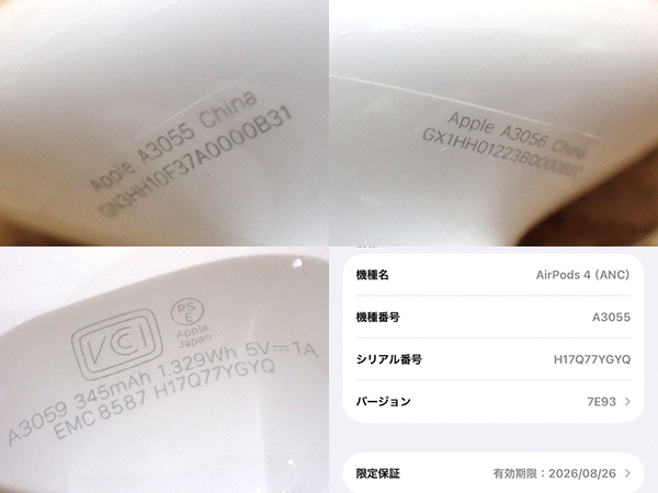【中古 良品】Apple 純正 AirPods 4 アクティブノイズキャンセリング搭載モデル MXP93J/A 本体 ワイヤレス イヤホン(QLA1207-1) ■状態■ [充電ケース/イヤホン] ケースに擦れはありますが、 目立つ大きな傷はありません。 イヤホンに目立つ大きな傷はありません。 写真でご確認ください。 動作問題なし ペアリング・通電確認済み 初期化済み 外箱に傷みがあります。 ■保証状況■ 限定保証 有効期限:2026年8月26日 詳しくはアップル公式 保証状況サイトでご確認ください。 ■モデル型番■ MXP93J/A ■製造番号■ H17Q77YGYQ ■付属品■ 写真でご確認いただけるものがすべてです。 2026/2/18 K