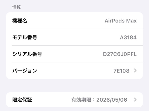 【中古 良品】Apple 純正 AirPods Max USB-C MWW43ZA/A ミッドナイト ワイヤレスヘッドフォン 本体(QGA742-1) ■状態■ [本体] 使用に伴う擦れはありますが、 目立つ大きな傷はありません。 [スマートケース] 使用に伴う擦れはありますが、 目立つ大きな傷はありません。 写真でご確認ください。 動作に問題なし ペアリング・通電確認済み ■Apple保証■ 限定保証:2026年5月26日 詳しくはアップル公式 保証状況サイトでご確認ください。 ■モデル型番■ MWW43ZA/A ■製造番号■ D27C6J0PFL ■付属品■ 写真でご確認いただけるものがすべてです。 2025/7/29 K
