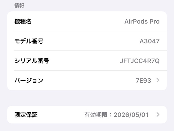 【中古 美品】Apple 純正 AirPods Pro 第2世代 MagSafe充電ケース USB-C MTJV3J/A 本体 (QGA587-2) ■状態■ [充電ケース/イヤホン] ケースに薄っすらとした擦れはありますが、 目立つ大きな傷はありません。 イヤホンに目立つ大きな傷はありません。 写真でご確認ください。 動作問題なし ペアリング・通電確認済み 初期化済み ■保証状況■ 購入日: 2025年5月2日 限定保証 有効期限:2026年5月1日 詳しくはアップル公式 保証状況サイトでご確認ください。 ■モデル型番■ MTJV3J/A ■製造番号■ JFTJCC4R7Q ■付属品■ 写真でご確認いただけるものがすべてです。 2025/8/2 K
