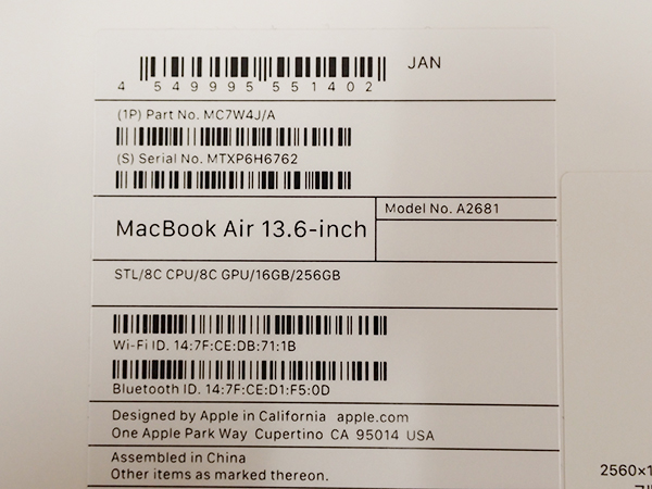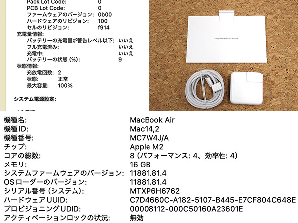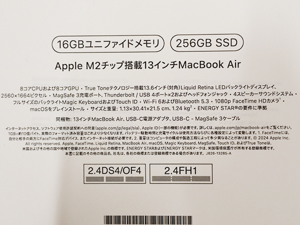 【中古 極美品】MacBook Air 13.6インチ 2024年 スターライト MC7W4J/A[M2チップ 8コア/16GB/SSD:256GB] 本体 充放電回数2回(QHA193-2) ■状態■ [本体] 擦れや傷などなくとても綺麗な状態です。 [バッテリー] バッテリー最大容量 100% 充放電回数 2回 状態 : 正常 ※出荷時の動作確認等で変わる可能性があります。 動作問題なし リカバリー済み 初期化後、動作確認の為 初期設定を行っております パスワードは解除しておりますので、 ログイン画面では何も入力せず Enterキーでログインできる状態にしてお送りいたします。 ■スペック■ MacBook Air (M2, 2024) 発売時期: Late 2024 カラー : スターライト CPU : Apple M2チップ 8コア メモリ : 16GB SSD : 256GB ■保証状況■ 購入日: 2025年8月4日 有効期限:2026年8月3日 詳しくはアップル公式 保証状況サイトでご確認ください。 ■モデル型番■ MC7W4J/A ■製造番号■ MTXP6H6762 ■付属品■ 写真でご確認いただけるものがすべてです。 2025/8/8 K