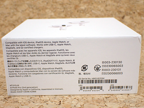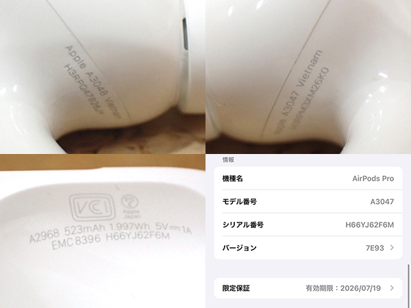 【中古】Apple 純正 AirPods Pro 第2世代 MagSafe充電ケース USB-C MTJV3J/A 本体(QJB54-1) ■状態■ [イヤホン] 傷や擦れがあります。 [充電ケース] 擦れがあります。 写真でご確認ください。 動作問題なし ペアリング・通電確認済み 初期化済み ■保証状況■ 限定保証 有効期限:2026年7月19日 詳しくはアップル公式 保証状況サイトでご確認ください。 ■モデル型番■ MTJV3J/A ■製造番号■ H66YJ62F6M ■付属品■ 写真でご確認いただけるものがすべてです。 2025/9/19 K
