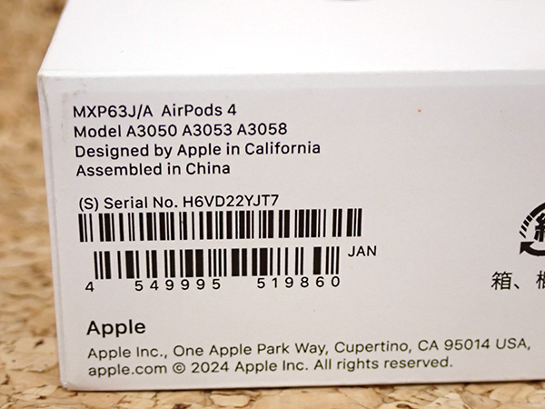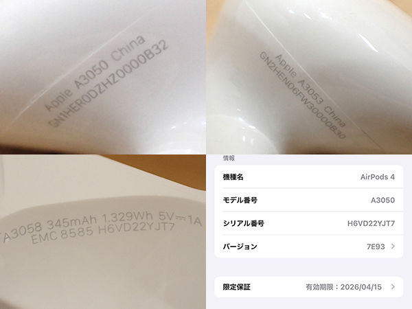 【中古 良品】Apple 純正 AirPods 4 MXP63J/A 本体 ワイヤレス イヤホン(QEA1170-1) ■状態■ [充電ケース/イヤホン] 薄っすらとした擦れはありますが、 目立つ大きな傷はありません。 写真でご確認ください。 動作問題なし ペアリング・通電確認済み 初期化済み 外箱に傷みがあります。 ■保証状況■ 購入日: 2025年4月16日 限定保証 有効期限:2026年4月15日 詳しくはアップル公式 保証状況サイトでご確認ください。 ■モデル型番■ MXP63J/A ■製造番号■ H6VD22YJT7 ■付属品■ 写真でご確認いただけるものがすべてです。 2025/9/19 K