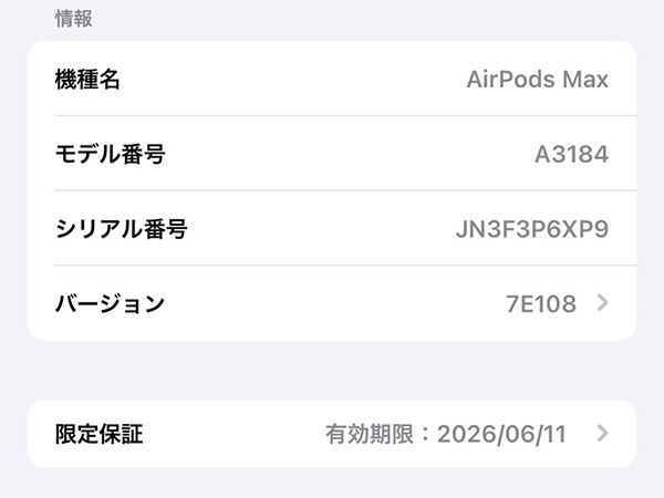 【中古 良品】Apple 純正 AirPods Max USB-C MWW43ZA/A ミッドナイト ワイヤレスヘッドフォン 本体(QHA626-1) ■状態■ [本体] 使用に伴う擦れはありますが、 目立つ大きな傷はありません。 [スマートケース] 使用に伴う擦れはありますが、 目立つ大きな傷はありません。 写真でご確認ください。 動作に問題なし ペアリング・通電確認済み ■Apple保証■ 購入日: 2025年6月12日 限定保証:2026年6月11日 詳しくはアップル公式 保証状況サイトでご確認ください。 ■モデル型番■ MWW43ZA/A ■製造番号■ JN3F3P6XP9 ■付属品■ 写真でご確認いただけるものがすべてです。 2025/9/18 K