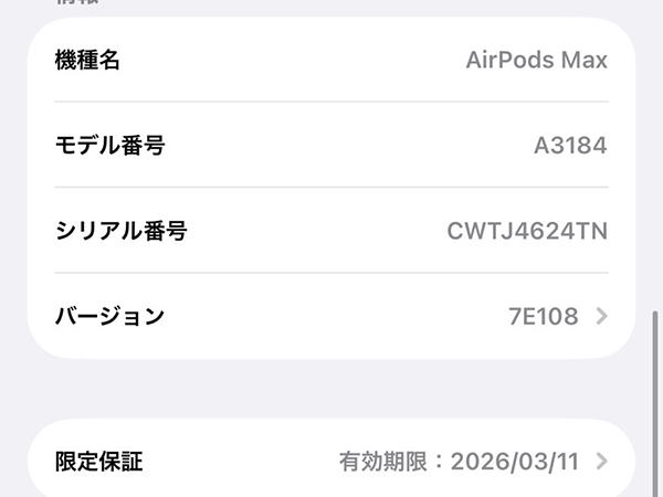 【中古 美品】Apple 純正 AirPods Max USB-C MWW63ZA/A ブルー ワイヤレスヘッドフォン 本体(QJA639-1) ■状態■ [本体] 使用に伴う擦れはありますが、 目立つ大きな傷はありません。 [スマートケース] 使用に伴う擦れはありますが、 目立つ大きな傷はありません。 写真でご確認ください。 動作に問題なし ペアリング・通電確認済み ■Apple保証■ 限定保証:2026年3月11日 詳しくはアップル公式 保証状況サイトでご確認ください。 ■モデル型番■ MWW63ZA/A ■製造番号■ CWTJ4624TN ■付属品■ 写真でご確認いただけるものがすべてです。 2025/9/23 K