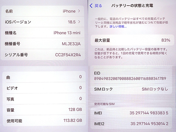 【中古】国内版 SIMフリー iPhone 13 mini 128GB スターライト 白 MLJE3J/A 本体 一括購入(QGA1055-1) ■状態■ 国内版 SIMフリーモデルです。 [本体/液晶] キズや擦れがあります。 [バッテリー] 出品時の最大容量 83% ※出荷までの保管期間で1~2%変動する場合あり。 リセット済み 動作問題なし AppleID削除済み ■Apple保証■ 保証期限切れ 2023年4月13日に期限切れ 購入日: 2022年4月11日 詳しくはアップル公式 保証状況サイトでご確認ください。 ■モデル型番■ MLJE3J/A ■製造番号■ IMEI: 352971449833835 シリアル番号: CC2F54X2R4 ■付属品■ 本体のみ 2025/9/23 T