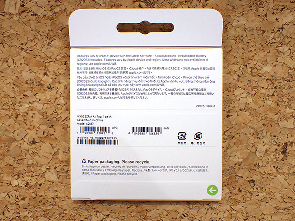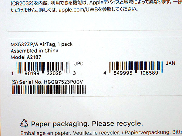 【新品 未開封】Apple 純正 AirTag エアタグ 1パック MX532ZP/A A2187 本体《全国一律送料430円》(QJA288-3) ■状態■ 新品未開封です。 ■保証状況■ 購入日: 2025年9月6日 限定保証 有効期限:2026年9月5日 詳しくはアップル公式 保証状況サイトでご確認ください。 ※未開封での出品になりますので、補償や返品はお受けできません。 ■モデル型番■ MX532ZP/A ■製造番号■ HGQQ7523P0GV ■付属品■ 購入時のものはすべてございます。 ※購入レシートや納品書等はございません 2025/9/23 T