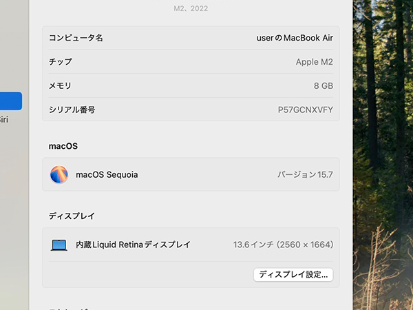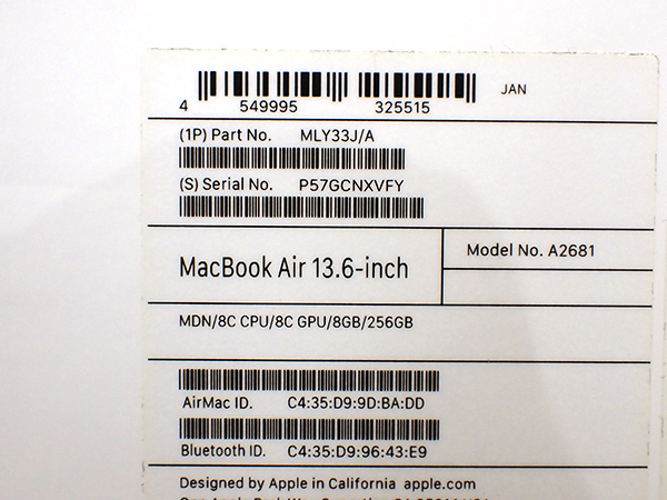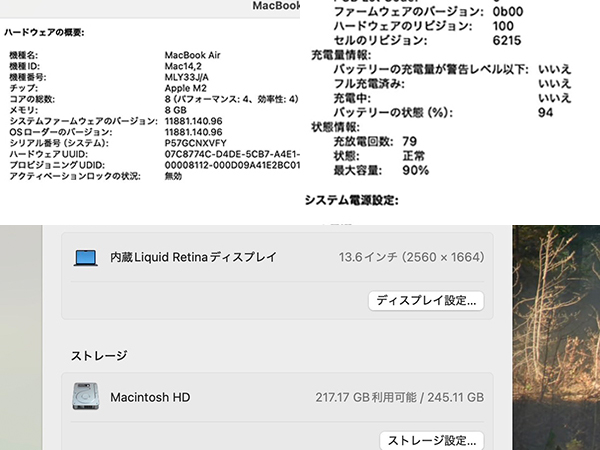 【中古】MacBook Air 13.6インチ 2022年 MLY33J/A ミッドナイト [M2チップ 8コア/8GB/SSD:256GB](QJB140-1) ■状態■ [本体/液晶] 傷や擦れ、テカリがあります。 液晶ガラスに擦れがあります。 [バッテリー] 充放電回数 79回 最大容量 90% ※出荷時の動作確認等で変わる可能性があります。 画像でご確認ください 動作問題なし リカバリー済み 初期化後、動作確認の為 初期設定を行っております パスワードは解除しておりますので、 ログイン画面では何も入力せず Enterキーでログインできる状態にしてお送りいたします。 ■スペック■ MacBook Air (M2, 2022) 発売時期: Mid 2022 カラー : ミッドナイト CPU : Apple M2チップ 8コア メモリ : 8GB SSD : 256GB ■保証状況■ 保証期限切れ 購入日: 2023年8月28日 2024年8月28日に期限切れ 詳しくはアップル公式 保証状況サイトでご確認ください。 ■モデル型番■ MLY33J/A ■製造番号■ P57GCNXVFY ■付属品■ 写真でご確認いただけるものがすべてです。 2025/10/16 K