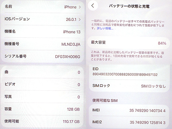 【中古 美品】国内版SIMフリー iPhone 13 128GB スターライト 白 MLND3J/A 本体 一括購入(QKA814-2) ■状態■ SIMフリー端末です。 [本体/液晶] フレームに小さなキズがあります。 その他に目立つ傷や擦れはなく全体的に綺麗です。 [バッテリー] 出品時の最大容量 84% ※出荷までの保管期間で1~2%変動する場合あり。 リセット済み 動作問題なし AppleID削除済み ■Apple保証■ 保証期限切れ 購入日: 2022年3月26日 2023年3月26日に期限切れ 詳しくはアップル公式 保証状況サイトでご確認ください。 ■モデル型番■ MLND3J/A ■製造番号■ IMEI: 357492901407344 シリアル番号: DF03XH006G ■付属品■ 本体のみ 2025/10/24 T